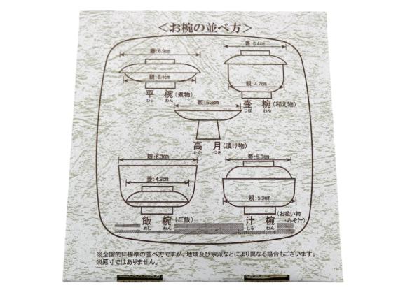 外箱裏面と御椀と箸の箱の蓋裏側に並べ方が印刷されており、宗派・地域を問わず使えます。